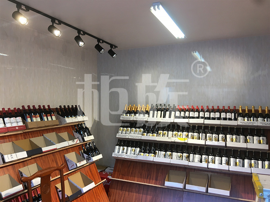The exterior of the display case is painted black, simple and atmospheric. The interior plane decoration, with spotlights and bright and clean vision, can well attract the attention of customers to a wide variety of red wine products.