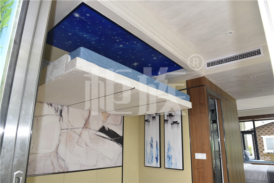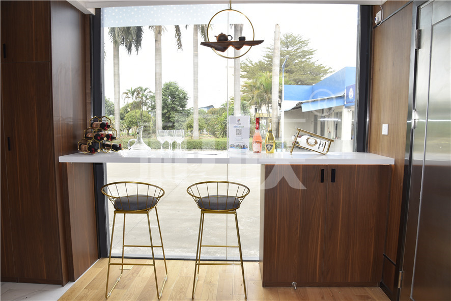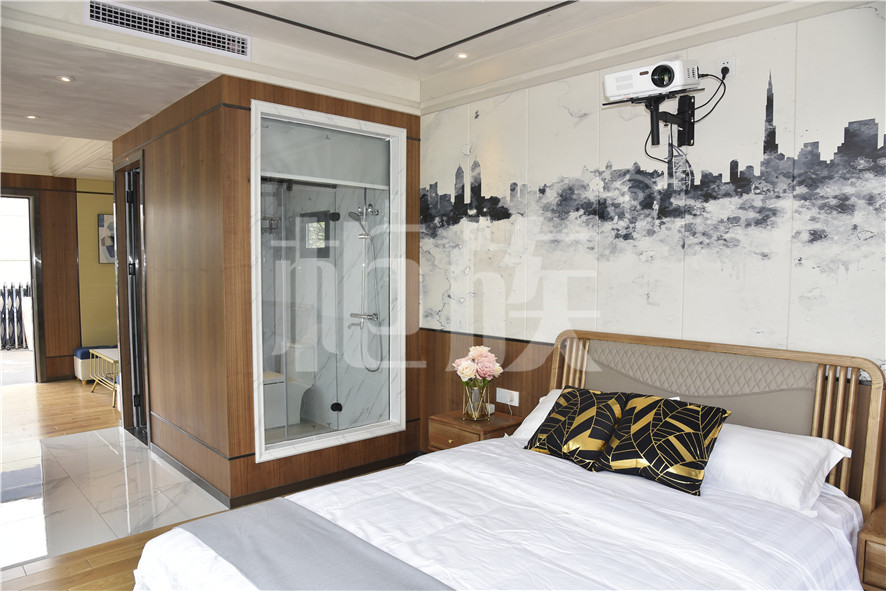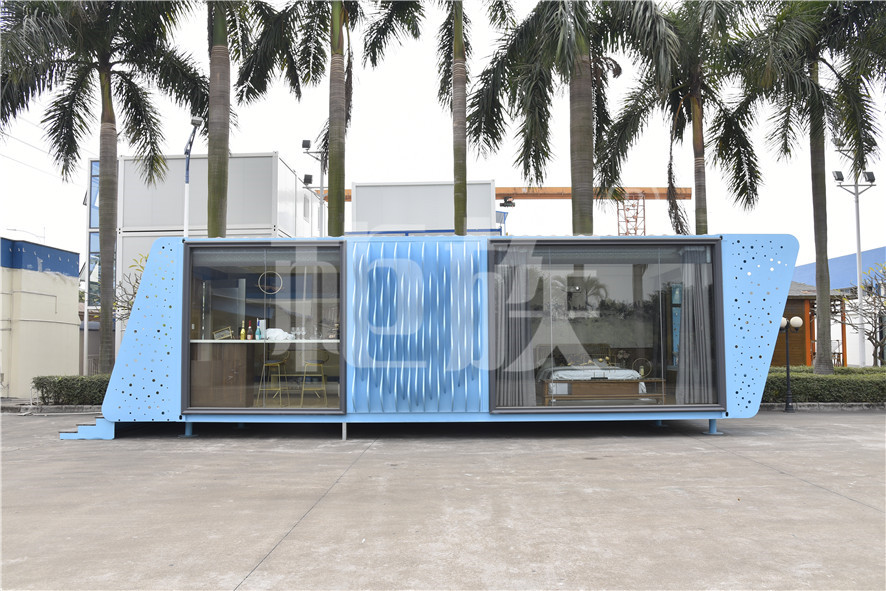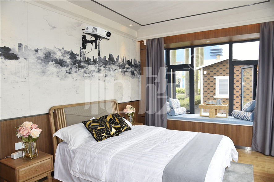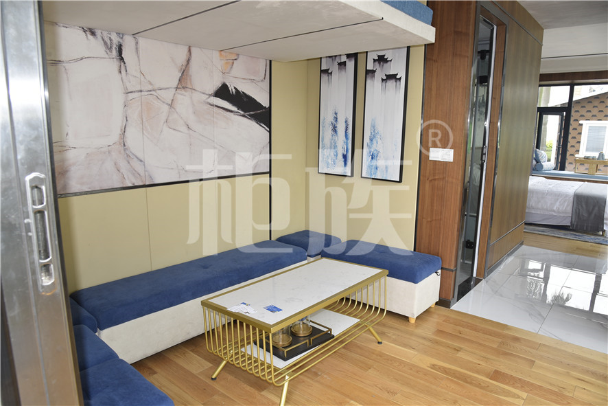 功能布局:入戶臺階,箱子整體抬高,前廳設(shè)吧臺和茶幾,樓面為隱藏式升降床,中部為衣柜、洗手臺及衛(wèi)生間,臥室內(nèi)帶飄窗陽臺,配影音系統(tǒng)。大面積落地玻璃窗,適合觀景。設(shè)計用途為景區(qū)特色民宿。